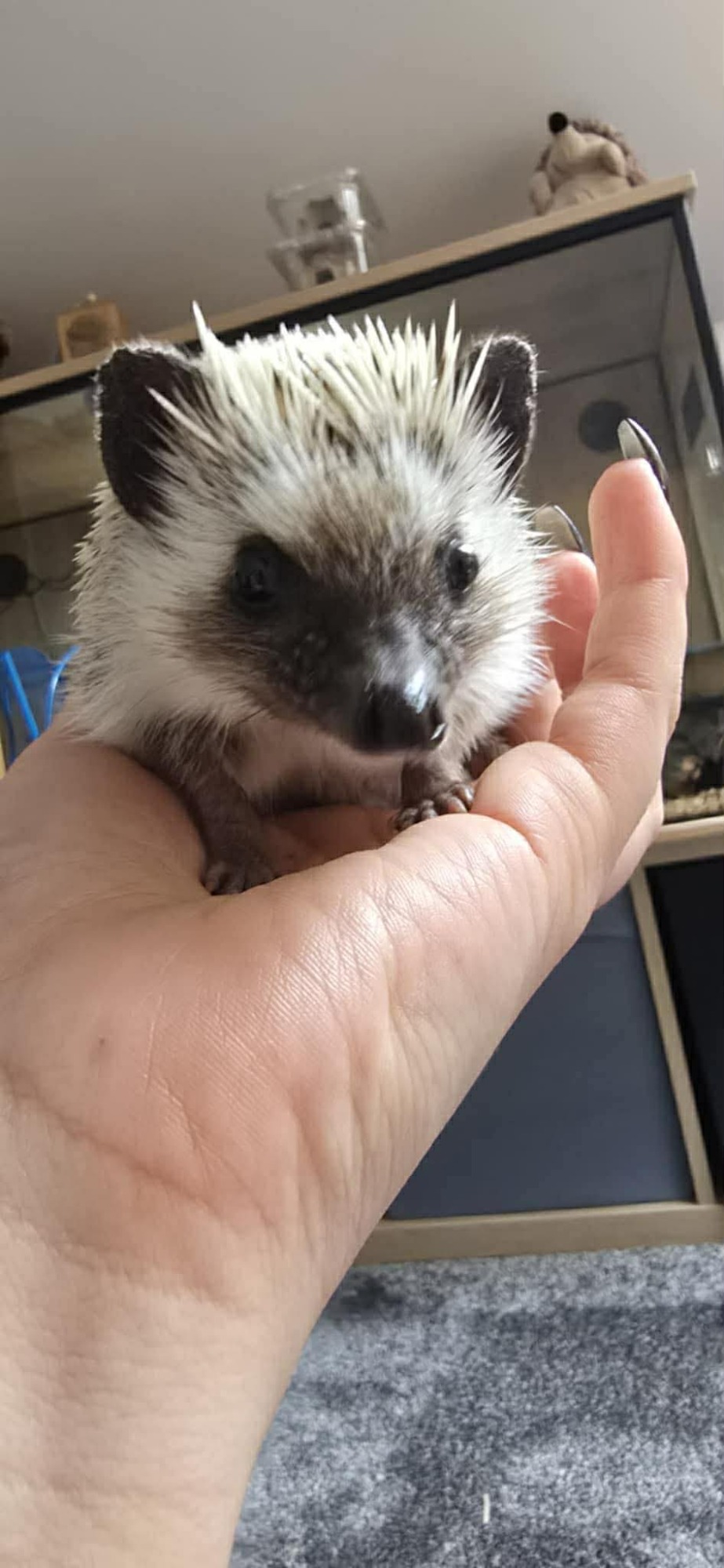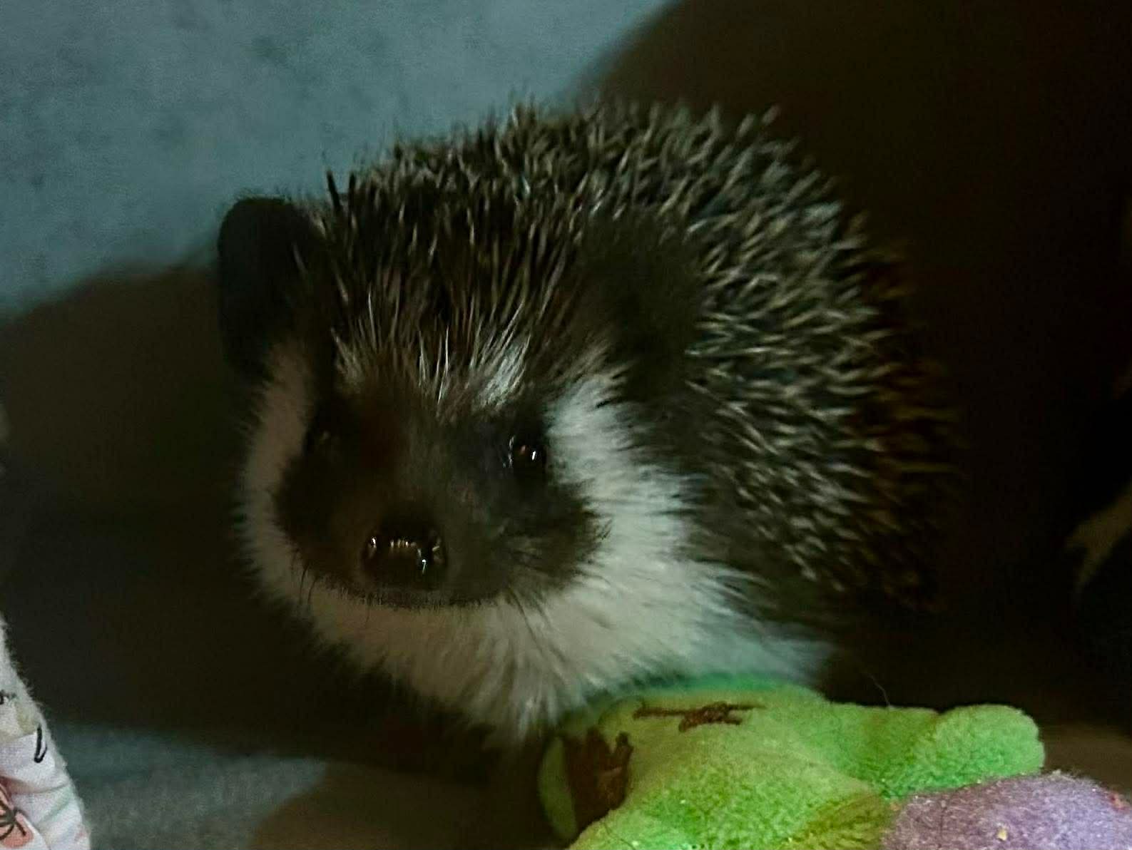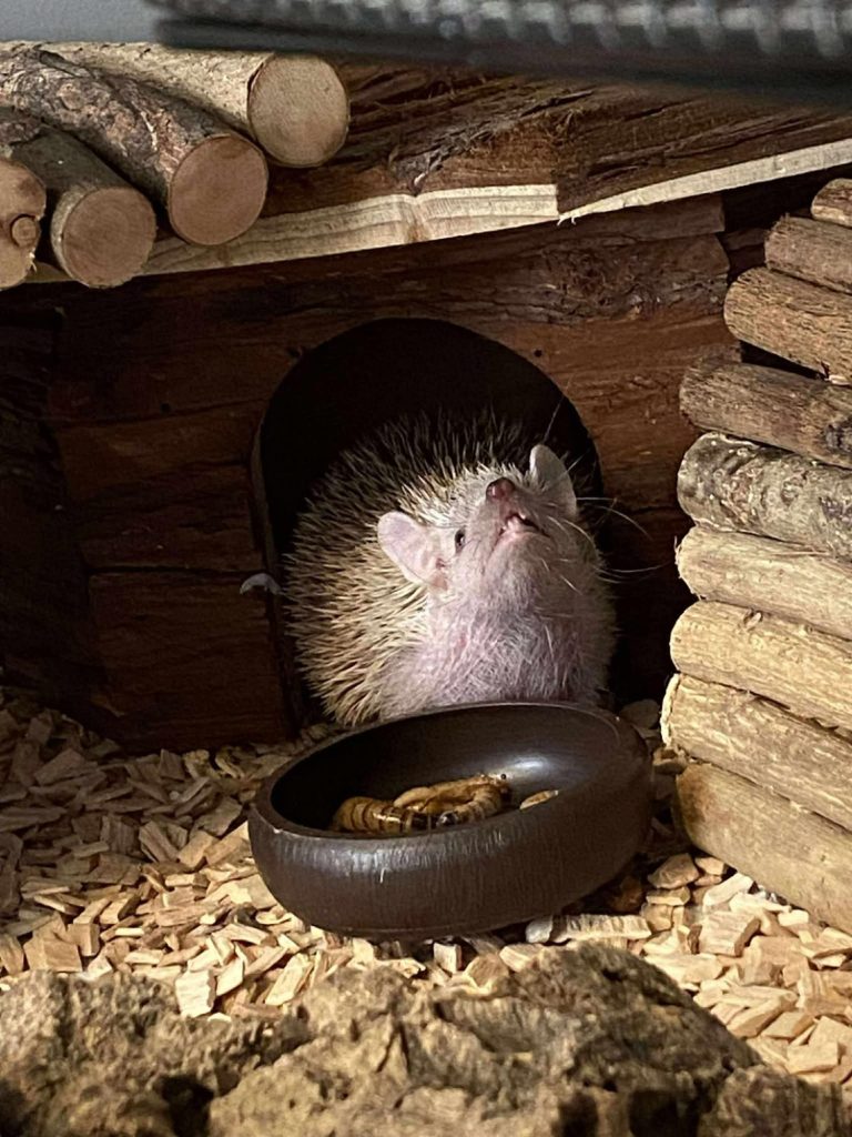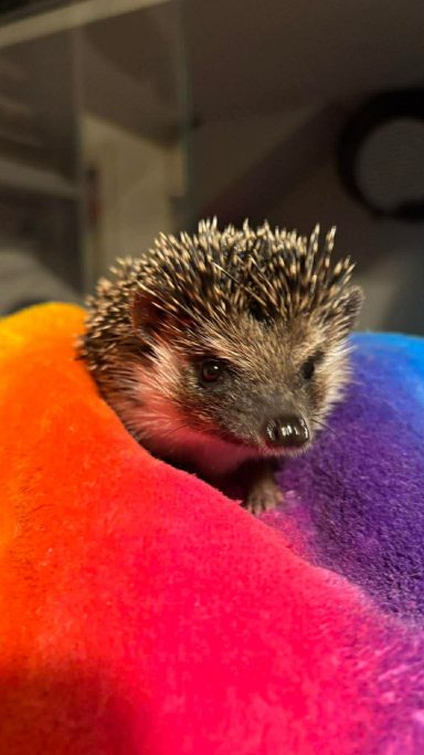 About: Arrival date 15/2/26. Enzo huffs and spikes a bit when first awoken (who doesn't?) but now he is settling into his new foster home, he is enjoying cuddles. He loves his wheel, often whelling 6-8 hours a night. He hates beds, he has to sleep under a blanket. Had never tried bugs before his foster home, he now practically inhales any kind, his favourite being wax worms.
